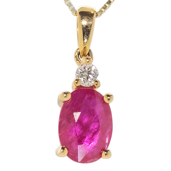 Oval ruby set in 14k yellow gold with a .04 carat diamond accent set at the top