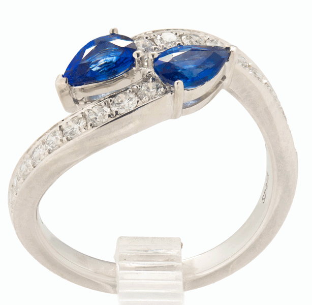 A pretty bypass design in 18k white gold by Spark Creations, the pear shaped blue sapphires are bright and richly colored, and their shape works exceptionally well in this design. The natural diamonds sparkle beautifully and are a nice accent to the gemstones. 1.10 carats of sapphires, .42 carat of diamonds, 18k white gold.