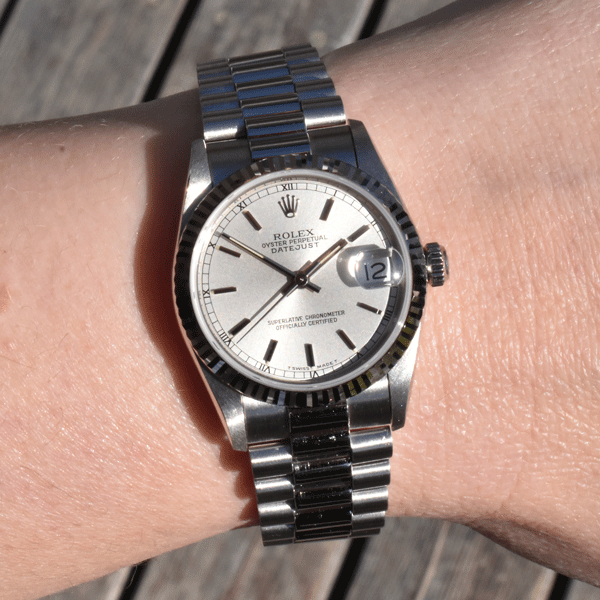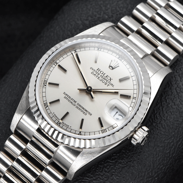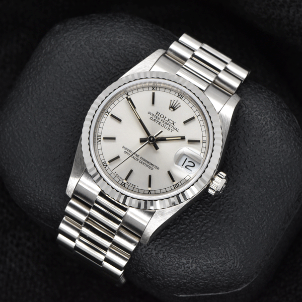 1996 Midsize Rolex Datejust President 31mm 18K White Gold Silver Stick Dial 68279