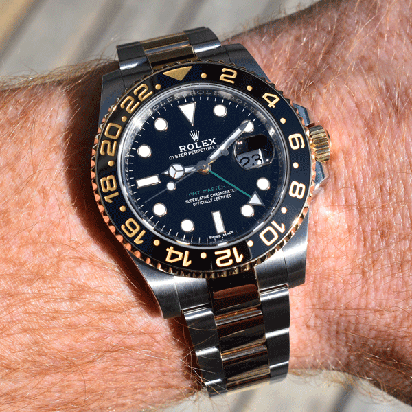 Bezel: 18K Yellow Gold Bidirectional 24hr Bezel with Black Ceramic Insert