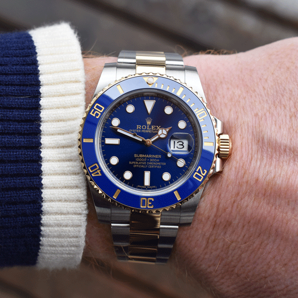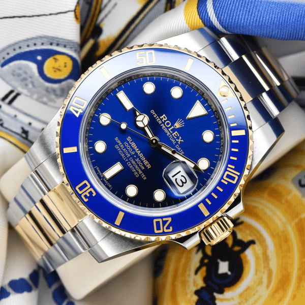 Bezel: 18K Yellow Gold Rotating Dive Bezel with Blue Ceramic Insert