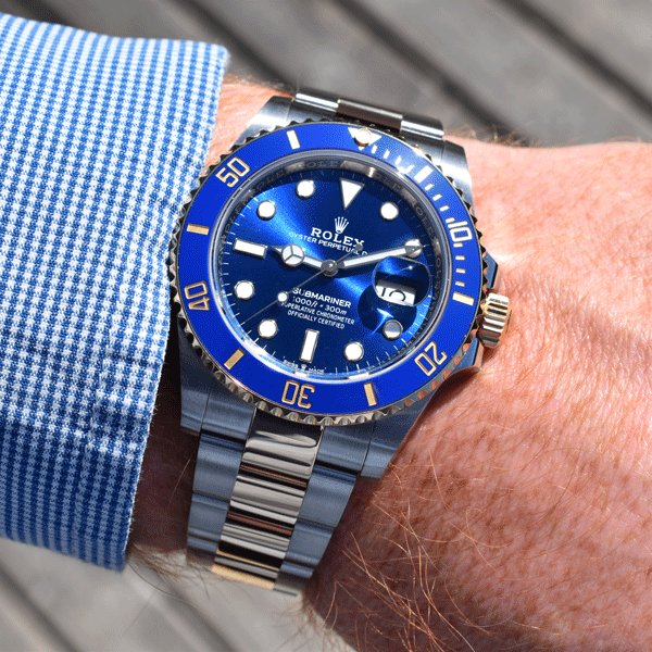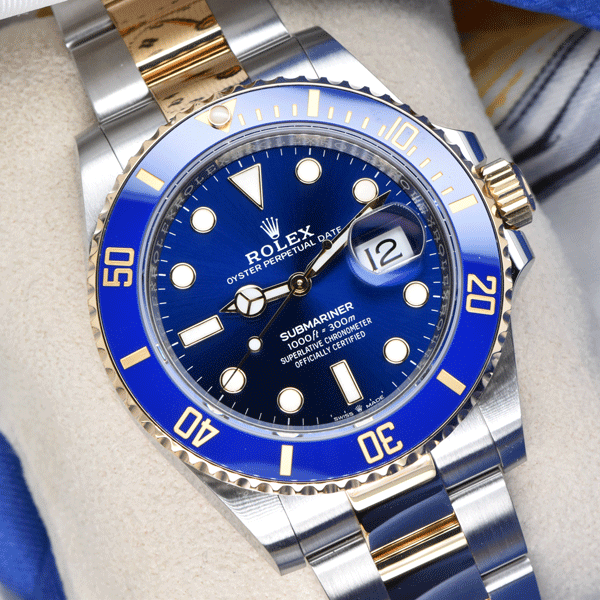 Bezel: 18K Yellow Gold Rotating Dive Bezel with Blue Ceramic Insert