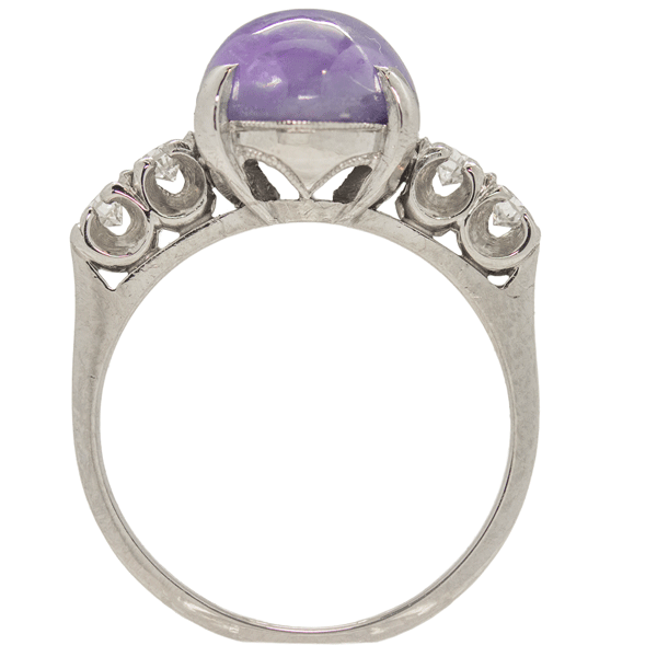 6 point natural lavender star sapphire ring. The setting is Platinum and has .20 carats of diamonds.