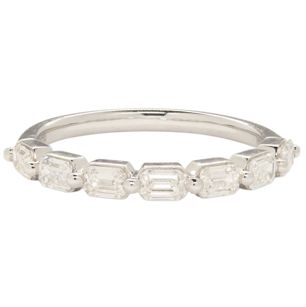 An absolutely elegant ring crafted in 18k white gold featuring 7 emerald cut diamonds set across the top totaling .75 carat. The shared prong style setting shows off the diamonds beautifully, and the emerald cuts give this ring an elevated look compared to the traditional round diamond bands. 2.60 mm wide at the top, 1.70 mm wide at the base of the band. Size 6, resizable.