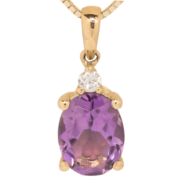 14k yellow gold setting with an oval amethyst and diamond accent. .04ctw diamond. Chain sold separately.