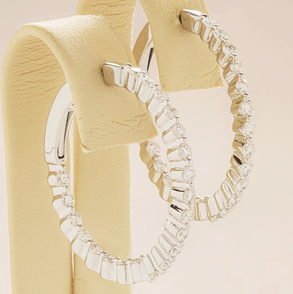 Thie diamonds in this pair of 14k white gold lock back hoop earrings are SI1 - SI2 in clarity and D in Color with a total weight of 1.37 carats. The diamonds are set in a inside out style and the hoops have a scollop look.