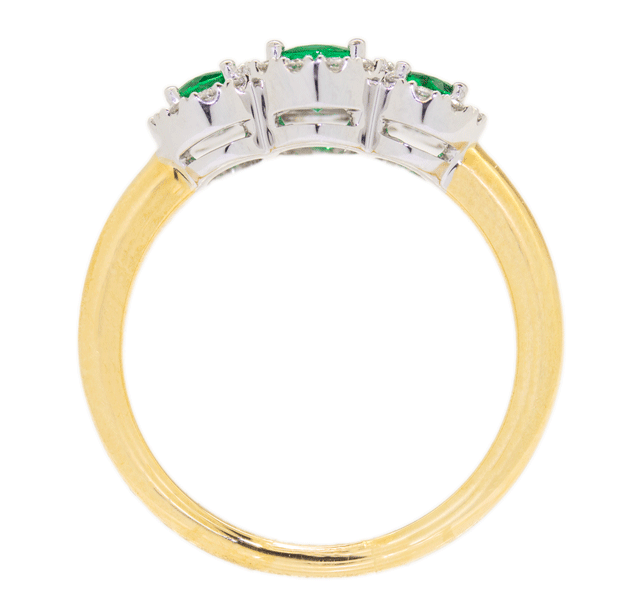 Boasting a two tone gold design, this classic "3-stone" ring features gorgeous emerald gemstones surrounded with natural diamonds. This brand, Spark Creations, use very fine quality diamonds and gems, and are beautifully made. The 3 emeralds total .71 carat, and there are .23 carats of diamonds in this 18k ring.