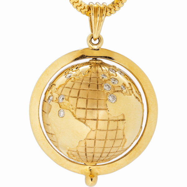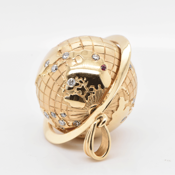 14K Yellow Gold Spinning Globe Pendant 14 Diamonds 1 Ruby